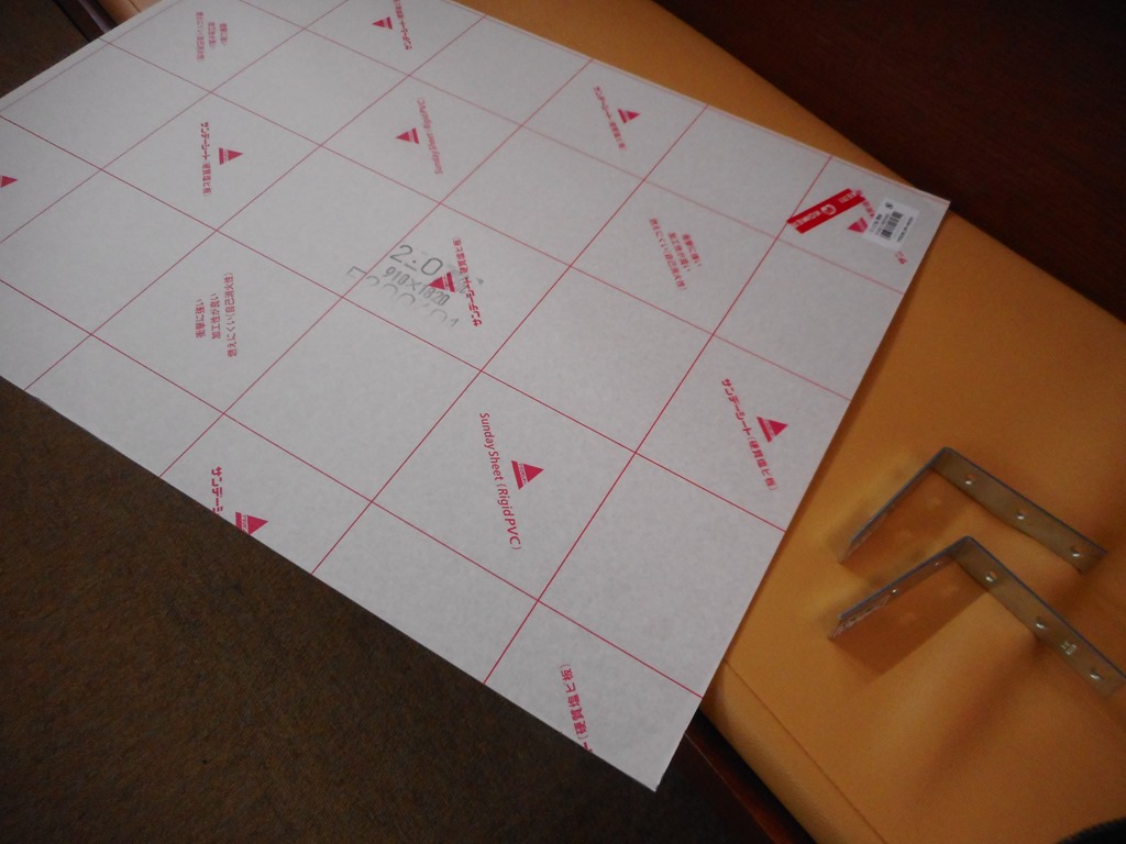 近くのホームセンターで「硬質塩ビ版」のクリアーというものを買ってきました。大きさは、とりあえず、60センチ×45センチです。それとこの塩ビ版を立てるために、L字金具も二つ買いました。ちなみに塩ビ版が1,180円、L字金具は一つ158円で二つなので316円、といった出費です。(この時点で、塩ビ版とL字金具の接続方法については何も考えていませんでした。相変わらずの泥縄方式です。)