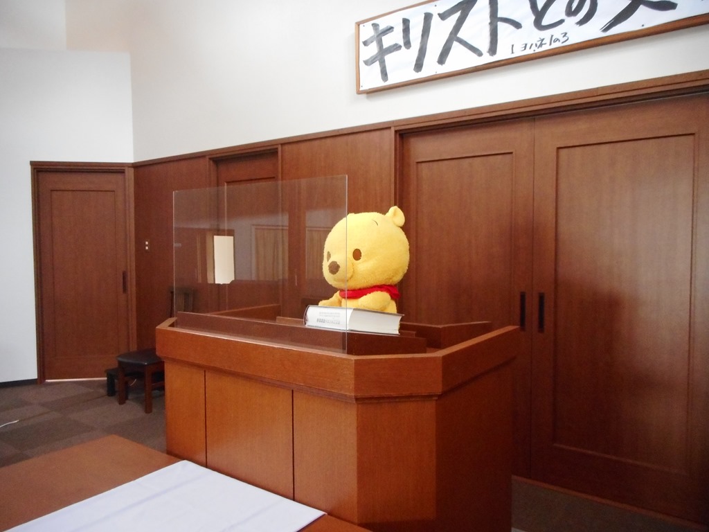 講壇のくまさんの顔と一番前の席に座った人の顔との間は、約3メートルでした。たいてい一番前には誰も座らないので、その後ろの人となると、プラス1メートルで、約4メートル。そこに今回導入の飛沫防止スクリーンということで、よろしいかな、と思いますが、いかがでしょうか。