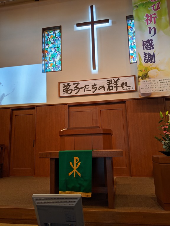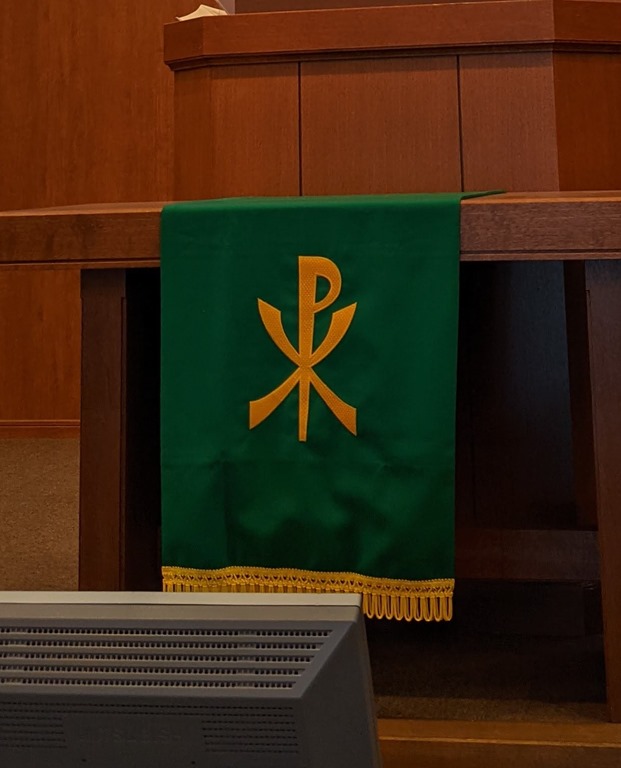 ずいぶん前ではありますが、礼拝堂の講壇前、聖餐卓に掲げられている緑のバナーについて質問がありましたので、少し記しておきます。