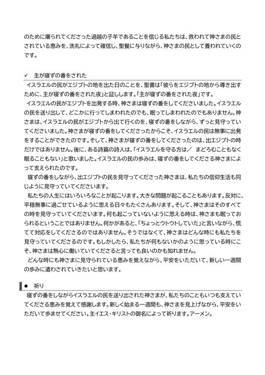 イスラエルの民がエジプトの地を出た日のことを、聖書は「彼らをエジプトの地から導き出すために、主が寝ずの番をされた夜」と証しします。「主が寝ずの番をされた夜」です。