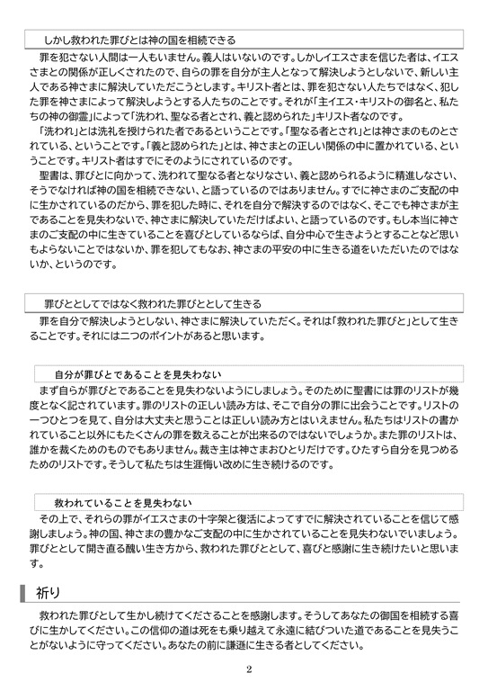 その上で、それらの罪がイエスさまの十字架と復活によってすでに解決されていることを信じて感謝しましょう。神の国、神さまの豊かなご支配の中に生かされていることを見失わないでいましょう。罪びととして開き直る醜い生き方から、救われた罪びととして、喜びと感謝に生き続けたいと思います。
