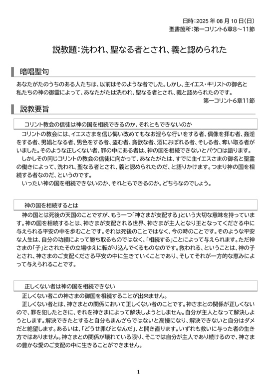 - 説教題:洗われ、聖なる者とされ、義と認められた