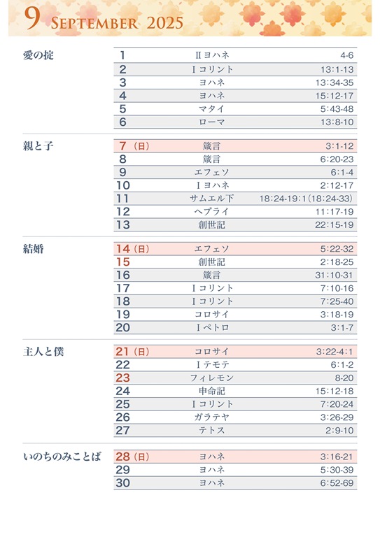 ※協会訳系の節によるものですので、新改訳でお読みの場合ずれていることがあります。読んでいてピンとこなければ協会訳系の聖書(共同訳2018,新共同訳、口語訳)で確認してみてください。