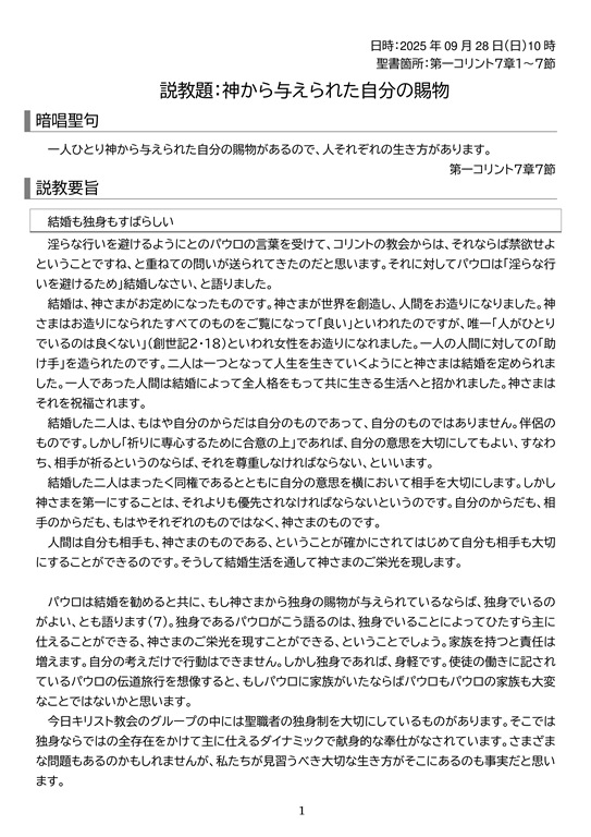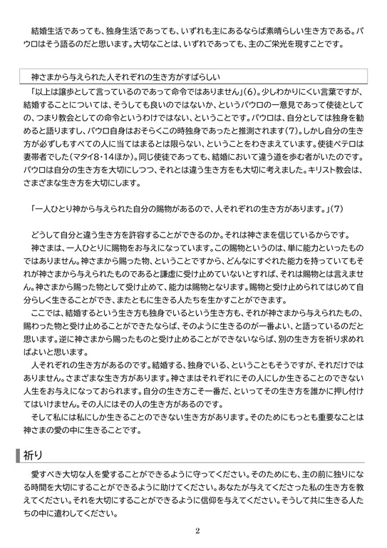結婚生活であっても、独身生活であっても、いずれも主にあるならば素晴らしい生き方である。パウロはそう語るのだと思います。大切なことは、いずれであっても、主のご栄光を現すことです。
