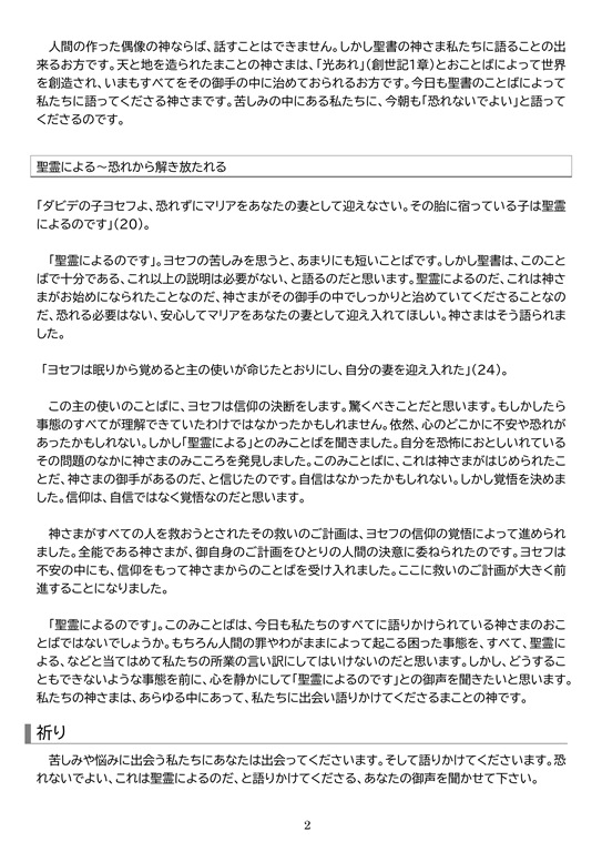 夢に現れた主の使いは、ヨセフに語りかけました。神さまは出会ってくださるお方であるとともに語りかけてくださるお方です。「ダビデの子ヨセフよ、恐れないでよい」。そう語ってくださるお方です。