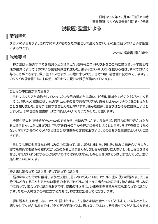 「聖霊によるのです」。ヨセフの苦しみを思うと、あまりにも短いことばです。しかし聖書は、このことばで十分である、これ以上の説明は必要がない、と語るのだと思います。聖霊によるのだ、これは神さまがお始めになられたことなのだ、神さまがその御手の中でしっかりと治めていてくださることなのだ、恐れる必要はない、安心してマリアをあなたの妻として迎え入れてほしい。神さまはそう語られました。
