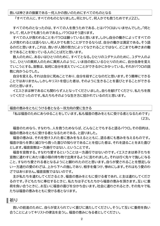 福音のためなら、すなわち、人を救うためならば、どんなことでもすると語るパウロ。その目的は、福音の恵みをともに受ける者となるためである、と語りました。