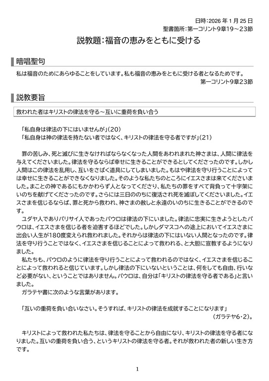 - 説教題:福音の恵みをともに受ける