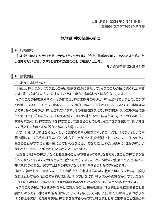 主日礼拝説教:2026年2月15日(日)