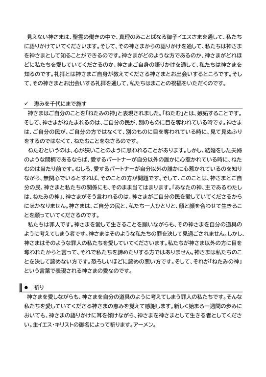 ねたむというのは、心が狭いことのように思われることがあります。しかし、結婚をした夫婦のような間柄であるならば、愛するパートナーが自分以外の誰かに心惹かれている時に、ねたむのは当たり前です。むしろ、愛するパートナーが自分以外の誰かに心惹かれているのを知りながら、無関心でいるとすれば、そのことの方が問題です。そして、このことは、神さまとご自分の民、神さまと私たちの関係にも、そのまま当てはまります。「あなたの神、主であるわたしは、ねたみの神」、神さまがそう言われるのは、神さまがご自分の民を愛していてくださるからにほかなりません。神さまは、ご自分の民と、私たち一人ひとりと、顔と顔を合わせて生きることを願っていてくださるのです。