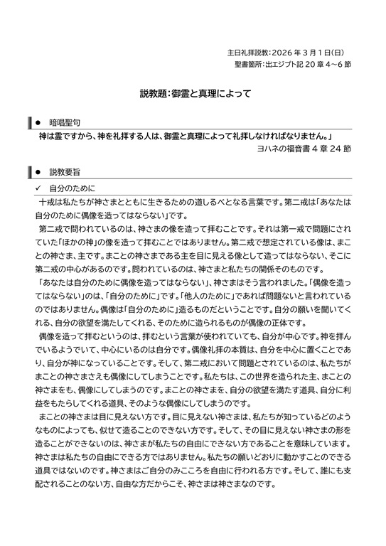 主日礼拝説教:2026年3月1日(日)