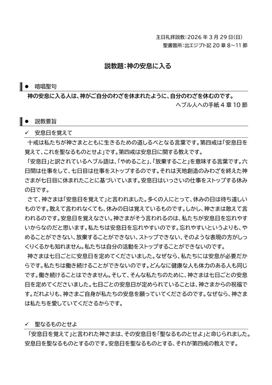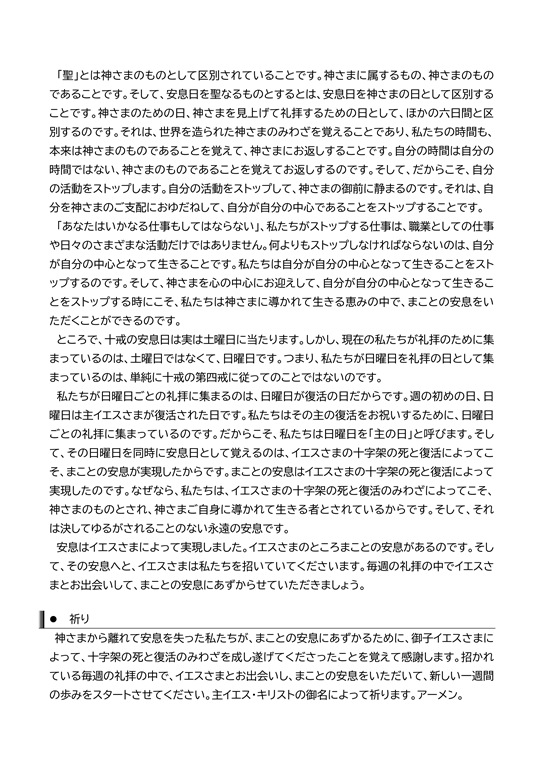 神さまから離れて安息を失った私たちが、まことの安息にあずかるために、御子イエスさまによって、十字架の死と復活のみわざを成し遂げてくださったことを覚えて感謝します。招かれている毎週の礼拝の中で、イエスさまとお出会いし、まことの安息をいただいて、新しい一週間の歩みをスタートさせてください。主イエス・キリストの御名によって祈ります。アーメン。